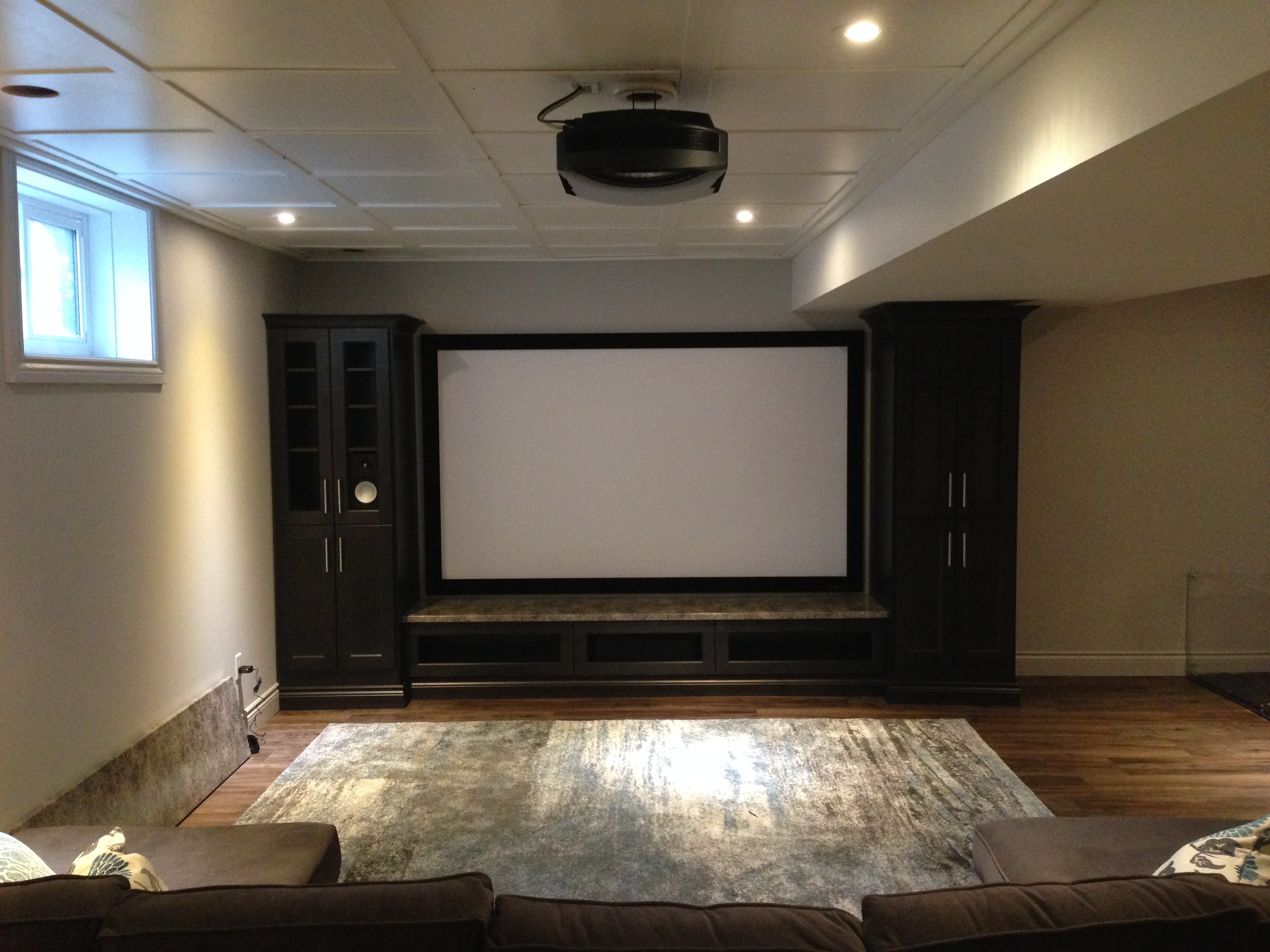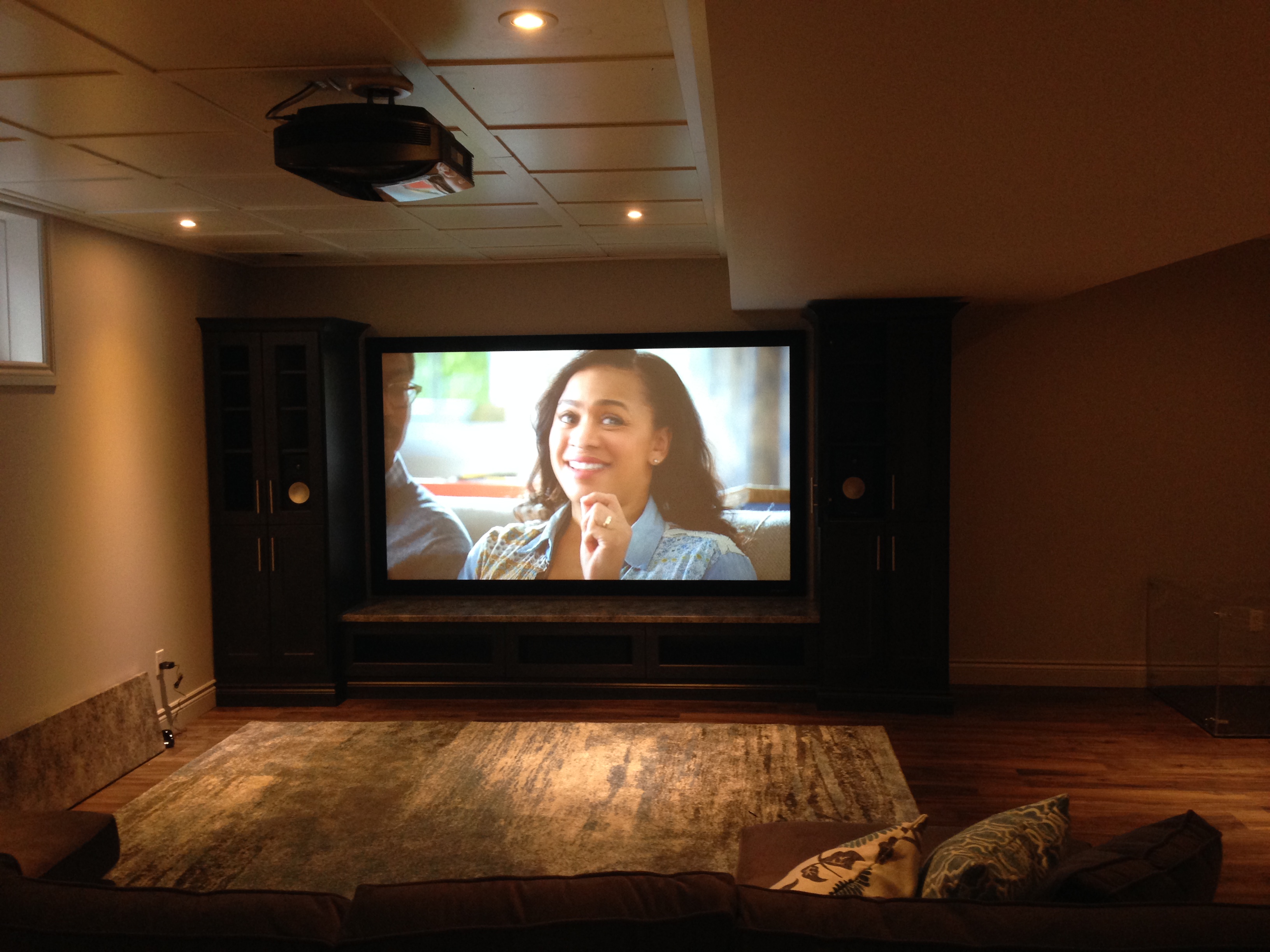 Sony VPL-HW40ES w fixed screen, Yamaha power, hidden Paradigm loudspeakers. Dec/14